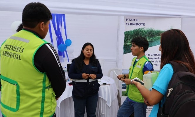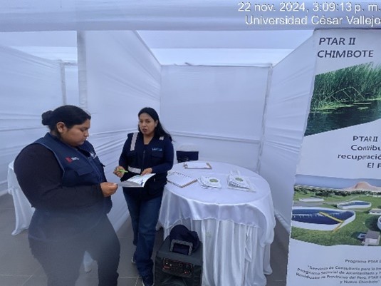La Universidad César Vallejo, sede Nuevo Chimbote, invitó a representantes del Consultor Implementador de la nueva PTAR II CHUMBOTE a participar en la Feria de Educación Ambiental, en la rotonda del campus académico, donde se exponen grandes proyectos que se realizan en la región Ancash, a fin de que los alumnos de diversas facultades conozcan aspectos importantes de cada uno de ellos.